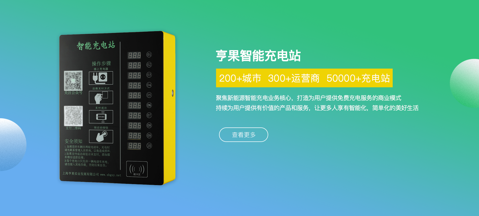 公司總部位于上海市青浦區趙巷新城經濟開發區,專注于新能源智能充電操作系統、智能電動車充電樁、充電樁行業運營管理平臺等多類相關 產品的研發、設計、銷售和運營,產品現已廣泛應用于國內各城市居民社區、高校、及商業綜合體車輛聚集區域及市政配套領域。